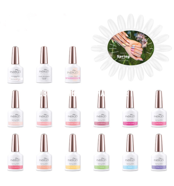 Spring collection – twelve hybrid polishes + base coat.Stencil 1 pcs.Top Baby Boomer 7 mlProtein base 7 ml